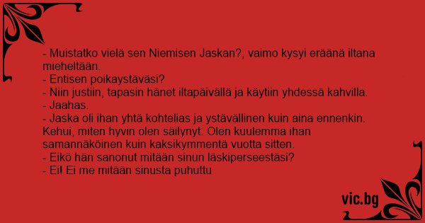 - Muistatko vielä sen Niemisen Jaskan?, vaimo kysyi eräänä iltana mieheltään.