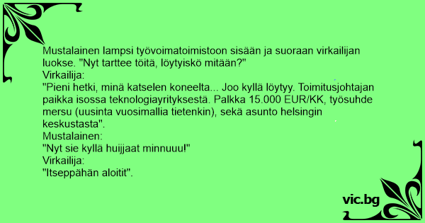 Mustalainen lampsi työvoimatoimistoon sisään ja suoraan virkailijan luokse. "Nyt tarttee töitä, löytyiskö mitään?"