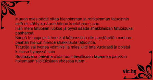 Niinpä tatuoija pisti hanskat käteensä ja alkoi piirtämään miehen päähän hienon hienoa shakkilauta tatuointia.