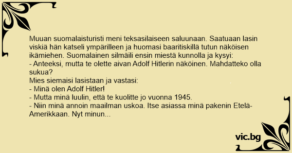 - Anteeksi, mutta te olette aivan Adolf Hitlerin näköinen. Mahdatteko olla sukua?