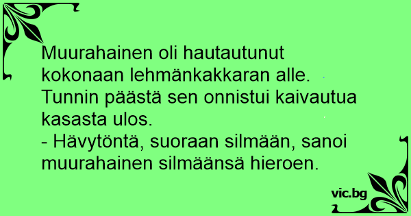 - Hävytöntä, suoraan silmään, sanoi muurahainen silmäänsä hieroen.