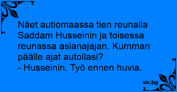 Näet autiomaassa tien reunalla Saddam Husseinin ja toisessa reunassa asianajajan. Kumman päälle ajat autollasi?
