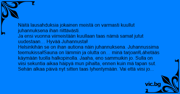 Helsinkihän se on ihan autiona näin juhannuksena. Juhannussima teemukissa!Sauna on lämmin ja olutta on… minä tarjoan!Lähetääs käymään tuolla halkopinolla. Jaaha, eno sammuikin jo. Sulla on viisi sekuntia aikaa häipyä mun pihalta, ennen kuin mä tapan sut. Sehän alkaa päivä nyt sitten taas lyhentymään. Vai että viisi jo hukkunut näin juhannuksena… noo, eiköhän se iltaa kohden siitä vielä nouse. Paskat mitään rappusia pitkin, vaan pääedellä mennään tuosta laiturilta että molskahtaa. Se on juhannus nyt. Tässä olis nyt tätä juhannussimaa. Tuletkos tonne aittaan, niin miä voisin näyttää vähän juhannustaikoja. Vihannes se on makkarakin. Eikös se lippu saa olla salossa ihan yön yli, näin juhannuksena. ANNATKO PILLUA?!?