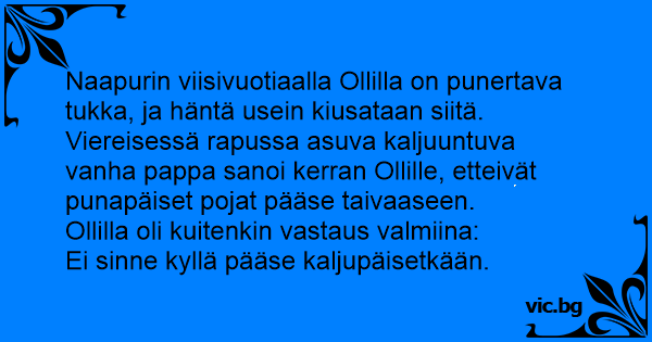 Viereisessä rapussa asuva kaljuuntuva vanha pappa sanoi kerran Ollille, etteivät punapäiset pojat pääse taivaaseen.