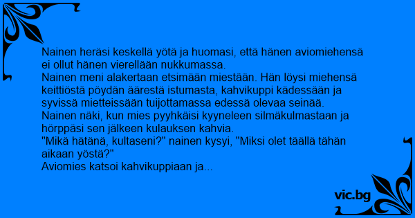 Nainen meni alakertaan etsimään miestään. Hän löysi miehensä keittiöstä pöydän äärestä istumasta, kahvikuppi kädessään ja syvissä mietteissään tuijottamassa edessä olevaa seinää.