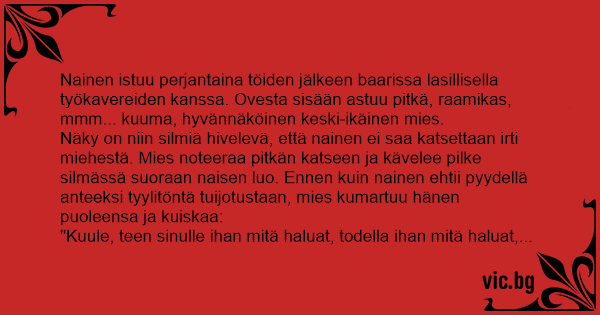 Nainen istuu perjantaina töiden jälkeen baarissa lasillisella työkavereiden kanssa. Ovesta sisään astuu pitkä, raamikas, mmm... kuuma, hyvännäköinen keski-ikäinen mies.