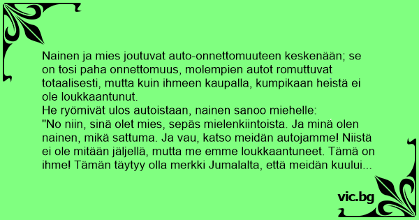 "No niin, sinä olet mies, sepäs mielenkiintoista. Ja minä olen nainen, mikä sattuma. Ja vau, katso meidän autojamme! Niistä ei ole mitään jäljellä, mutta me emme loukkaantuneet. Tämä on ihme! Tämän täytyy olla merkki Jumalalta, että meidän kuului tavata näin ja tutustua ja viettää yhdessä koko loppu ikäämme!"