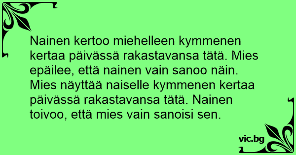 Nainen kertoo miehelleen kymmenen kertaa päivässä rakastavansa tätä. Mies epäilee, että nainen vain sanoo näin.