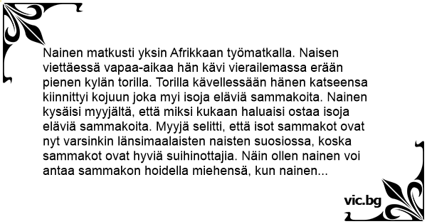 Nainen matkusti yksin Afrikkaan työmatkalla. Naisen viettäessä vapaa-aikaa hän kävi vierailemassa erään pienen kylän torilla. Torilla kävellessään hänen katseensa kiinnittyi kojuun joka myi isoja eläviä sammakoita. Nainen kysäisi myyjältä, että miksi kukaan haluaisi ostaa isoja eläviä sammakoita. Myyjä selitti, että isot sammakot ovat nyt varsinkin länsimaalaisten naisten suosiossa, koska sammakot ovat hyviä suihinottajia. Näin ollen nainen voi antaa sammakon hoidella miehensä, kun nainen potee päänsärkyä. Nainen tuumasi mielessään, että tuossapa erinomainen tuliainen aviomiehelle.