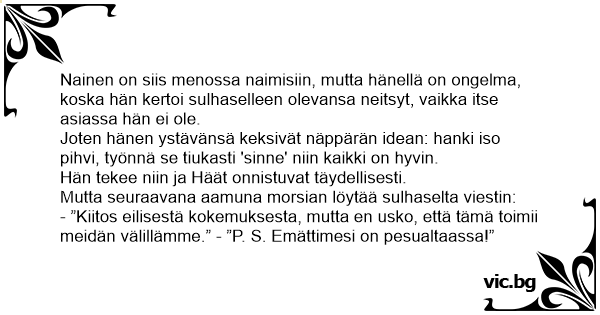 - ”Kiitos eilisestä kokemuksesta, mutta en usko, että tämä toimii meidän välillämme.” - ”P. S. Emättimesi on pesualtaassa!”