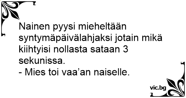 Vaimo tuli kotiin töistä ja sanoi miehelleen: - Kulta, minä haluaisin jotain pientä, metallinhohtoista joka kiihtyy muutamassa sekunnissa nollasta sataan. Seuraavana päivänä vaimo sai upeasti...