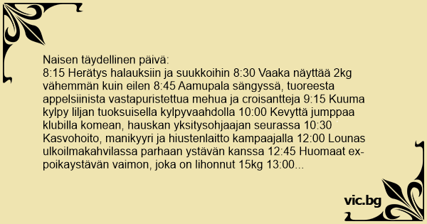 8:15 Herätys halauksiin ja suukkoihin 8:30 Vaaka näyttää 2kg vähemmän kuin eilen 8:45 Aamupala sängyssä, tuoreesta appelsiinista vastapuristettua mehua ja croisantteja 9:15 Kuuma kylpy liljan tuoksuisella kylpyvaahdolla 10:00 Kevyttä jumppaa klubilla komean, hauskan yksitysohjaajan seurassa 10:30 Kasvohoito, manikyyri ja hiustenlaitto kampaajalla 12:00 Lounas ulkoilmakahvilassa parhaan ystävän kanssa 12:45 Huomaat ex-poikaystävän vaimon, joka on lihonnut 15kg 13:00 Ostoksilla ystävien kanssa 15:00 Kauneusunet 16:00 Kukkalähetti tuo tusinan ruusuja, kortti on salaiselta ihailijalta 16:15 Kevyttä jumppaa klubilla, jonka jälkeen hieronta 17:30 Vaatteiden valinta illallista varten peilin edessä 19:30 Kynttiläillallinen kahdelle ja tanssia 22:00 Kuuma suihku(yksin) kotona 22:30 Rakastelua 23:00 Jälkikeskustelua sängyssä ja hykertelyä 23:15 Nukahdat hänen voimakkaalle käsivarrelleen Miehen täydellinen päivä: