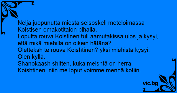Shanokaash shitten, kuka meishtä on herra Koishtinen, niin me loput voimme mennä kotiin.