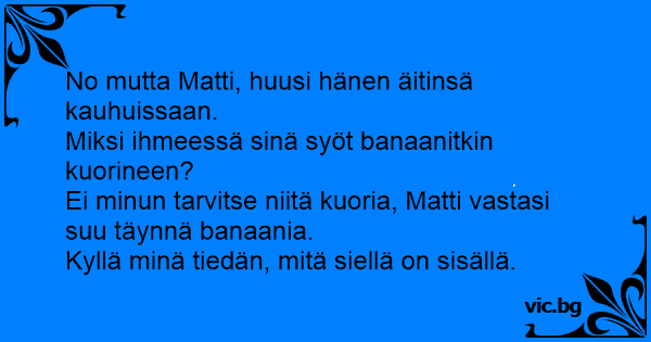 Ei minun tarvitse niitä kuoria, Matti vastasi suu täynnä banaania.