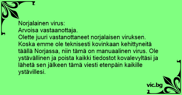 Olette juuri vastanottaneet norjalaisen viruksen. Koska emme ole teknisesti kovinkaan kehittyneitä täällä Norjassa, niin tämä on manuaalinen virus. Ole ystävällinen ja poista kaikki tiedostot kovalevyltäsi ja lähetä sen jälkeen tämä viesti etenpäin kaikille ystävillesi.