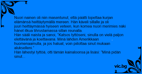 juuri heittäymässä hyiseen veteen, kun komea nuori merimies näki hänet itkua tihrustamassa sillan reunalla.