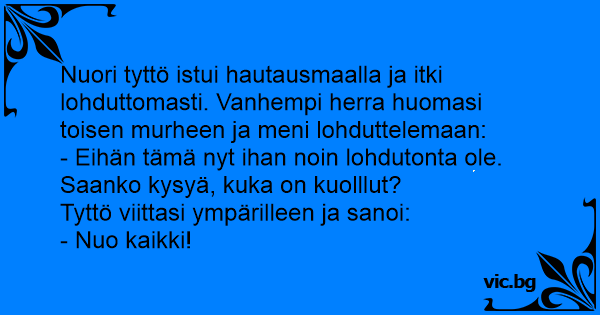Nuori tyttö istui hautausmaalla ja itki lohduttomasti. Vanhempi herra huomasi toisen murheen ja meni lohduttelemaan: