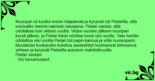 Nuoripari oli kuollut ennen hääpäivää ja kysyivät nyt Pietarilta, että voisivatko mennä naimisiin taivaassa. Pietari vastasi, että odottakaa noin viitisen vuotta. Viiden vuoden jälkeen nuoripari kyseli jälleen, ja Pietari käski odottaa toiset viisi vuotta. Taas heidän odotettua viisi vuotta Pietari tuli papin kanssa ja vihki nuorenparin. Muutaman kuukauden kuluttua vastavihityt huomasivat tehneensä virheen ja kysyivät Pietarilta avioeron mahdollisuutta.