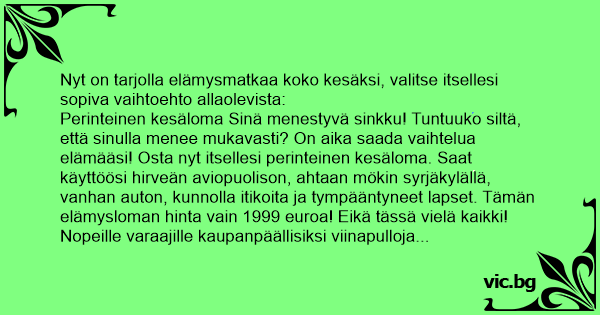 Perinteinen kesäloma Sinä menestyvä sinkku! Tuntuuko siltä, että sinulla menee mukavasti? On aika saada vaihtelua elämääsi! Osta nyt itsellesi perinteinen kesäloma. Saat käyttöösi hirveän aviopuolison, ahtaan mökin syrjäkylällä, vanhan auton, kunnolla itikoita ja tympääntyneet lapset. Tämän elämysloman hinta vain 1999 euroa! Eikä tässä vielä kaikki! Nopeille varaajille kaupanpäällisiksi viinapulloja piilottava anoppi kahdeksi viikoksi käyttöön sekä väkisin kalastamaan vievä mökkinaapuri.