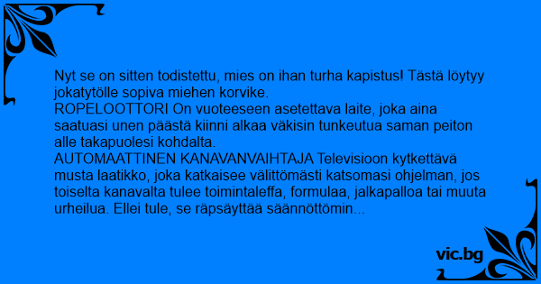 AUTOMAATTINEN KANAVANVAIHTAJA Televisioon kytkettävä musta laatikko, joka katkaisee välittömästi katsomasi ohjelman, jos toiselta kanavalta tulee toimintaleffa, formulaa, jalkapalloa tai muuta urheilua. Ellei tule, se räpsäyttää säännöttömin väliajoin auki teksti-tv:n ja selaa joka kerta läpi kaikki urheilutulokset.