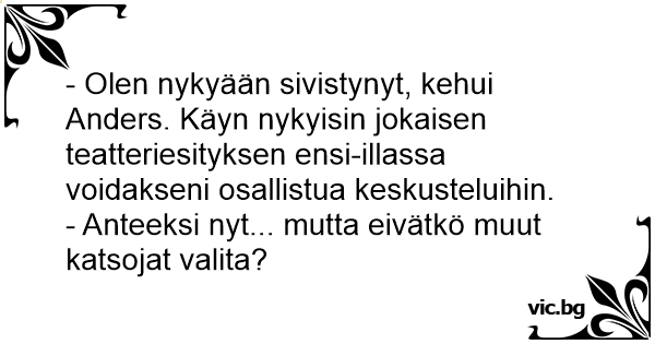 - Olen nykyään sivistynyt, kehui Anders. Käyn nykyisin jokaisen teatteriesityksen ensi-illassa voidakseni osallistua keskusteluihin.