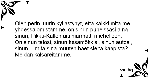Olen perin juurin kyllästynyt, että kaikki mitä me yhdessä omistamme, on sinun puheissasi aina sinun, Pikku-Kallen äiti marmatti miehelleen.