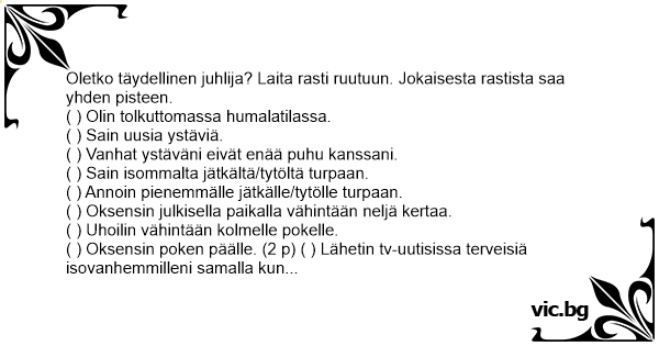 Oletko täydellinen juhlija? Laita rasti ruutuun. Jokaisesta rastista saa yhden pisteen.