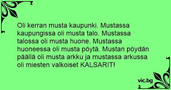Oli kerran musta kaupunki. Mustassa kaupungissa oli musta talo. Mustassa talossa oli musta huone. Mustassa huoneessa oli musta pöytä. Mustan pöydän päällä oli musta arkku ja mustassa arkussa oli miesten valkoiset KALSARIT!