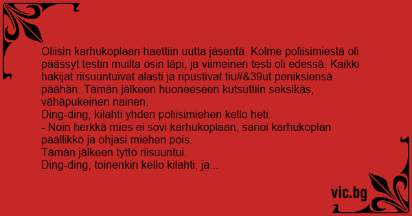 Oliisin karhukoplaan haettiin uutta jäsentä. Kolme poliisimiestä oli päässyt testin muilta osin läpi, ja viimeinen testi oli edessä. Kaikki hakijat riisuuntuivat alasti ja ripustivat tiu#&39ut peniksiensä päähän. Tämän jälkeen huoneeseen kutsuttiin seksikäs, vähäpukeinen nainen.