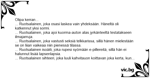 ... Ruotsalainen, joka osasi laskea vain yhdeksään. Häneltä oli katkennut yksi sormi.