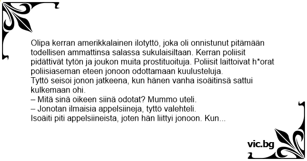 – Minä otan tekohampaat pois ja imen, isoäiti vastasi.