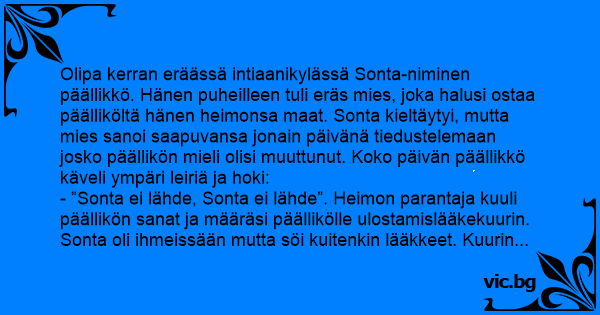 - ”Sonta ei lähde”. Parantaja määräsi päällikölle tällä kertaa pidemmän lääkekuurin. Eräänä päivänä päällikkö Sonta sanoi: