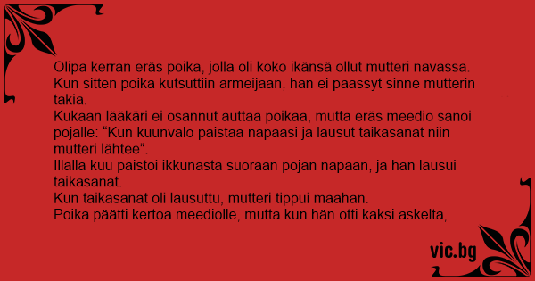 Kun sitten poika kutsuttiin armeijaan, hän ei päässyt sinne mutterin takia.