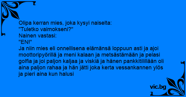 Ja niin mies eli onnellisena elämänsä loppuun asti ja ajoi moottoripyörillä ja meni kalaan ja metsästämään ja pelasi golfia ja joi paljon kaljaa ja viskiä ja hänen pankkitilillään oli aina paljon rahaa ja hän jätti joka kerta vessankannen ylös ja pieri aina kun halusi