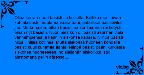 Olipa kerran nuori basisti, ja keikalla. Keikka meni aivan kohtalaisesti, muutama väärä ääni, pakolliset basistivitsit jne. Mutta naista, eihän basisti naista saannut (ei tietysti, eihän nyt basisti). Nuorimies kun oli basisti asui hän vielä vanhempiensa ja kauniin siskonsa kanssa. Niinpä basisti hiipaili hiljaa kotiinsa. Mutta siskonsa huoneen kohdalla basisti kuuli kummaa ääntä! Niinpä basisti päätti kurkistaa siskonsa huoneeseen, no siellähän siskolikka istui alastomana peilin ääressä, hyväili itseään ja hoki mä haluun komeen miehen, mä haluun komeen miehen... Basisti pyöritteli päätään ja ajatteli että nyt on siskoparka seonnut, ja painui nukkumaan. Seuraavana päivänä basisti oli jälleen keikalla. Keikka meni niin kuin basistin keikat yleensäkin. Muutama väärä ääni, pakolliset basistivitsit jne, mutta naista, eihän basisti naista saanut. Eikun kotiin ja hiljaa hiipien ettei muut herää. Siskon huoneen kohdalla kuului taas kummaa ääntä, ja taas basisti kurkisti sisään. Ja sama meininki, sisko alasti peilin ääressä, hyväilee itseään ja hokee mä haluun komeen miehen, mä haluun komeen miehen... Basisti tuumaa että seonnut on pitää saada hoitoon, ja painuu nukkumaan. Seuraavana päivänä basisti on jälleen keikalla, oli oikein naisten tanssit. Keikka meni hyvin, vain yksi väärä ääni eikä kukaan kertonut yhtään basistivitsiä mutta naista, eihän basisti naista saanut. Ja taas masentuneena kotiin, hiljaa hiipien. Ja kuinka ollakaan siskon huoneesta kuului kummaa ääntä, basisti kurkistaa sisään. No siellähän sisko oli alasti sängyssä peuhaamassa komean miehen kanssa! Basisti älistyi että noinko se toimii. Basisti syöksyy äkkiä omaan huoneeseen, vaatteet pois, alasti peilin eteen hyväilemään itseään ja hokee, mä haluun uuden basson, mä haluun uuden basson...