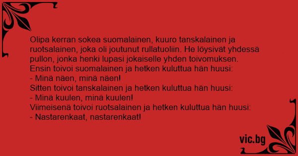 Olipa kerran sokea suomalainen, kuuro tanskalainen ja ruotsalainen, joka oli joutunut rullatuoliin. He löysivät yhdessä pullon, jonka henki lupasi jokaiselle yhden toivomuksen.