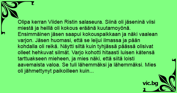 Olipa kerran Viiden Ristin salaseura. Siinä oli jäseninä viisi miestä ja heillä oli kokous eräänä kuutamoyönä. Ensimmäinen jäsen saapui kokouspaikkaan ja näki vaalean varjon. Jäsen huomasi, että se leijui ilmassa ja pään kohdalla oli reikä. Näytti siltä kuin tyhjässä päässä olisivat olleet hehkuvat silmät. Varjo kohotti hitaasti luisen kätensä tarttuakseen mieheen, ja mies näki, että siitä loisti aavemaista valoa. Se tuli lähemmäksi ja lähemmäksi. Mies oli jähmettynyt paikoilleen kuin kuvapatsas. Silloin haamu sai otteen miehestä ja PÖÖ!