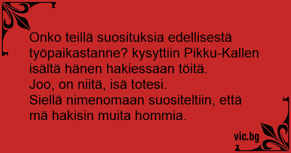 Onko teillä suosituksia edellisestä työpaikastanne? kysyttiin Pikku-Kallen isältä hänen hakiessaan töitä.