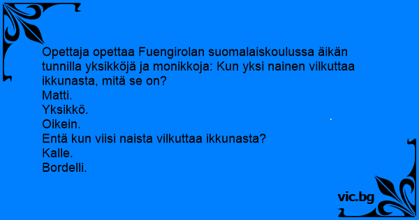 Opettaja opettaa Fuengirolan suomalaiskoulussa äikän tunnilla yksikköjä ja monikkoja: Kun yksi nainen vilkuttaa ikkunasta, mitä se on?