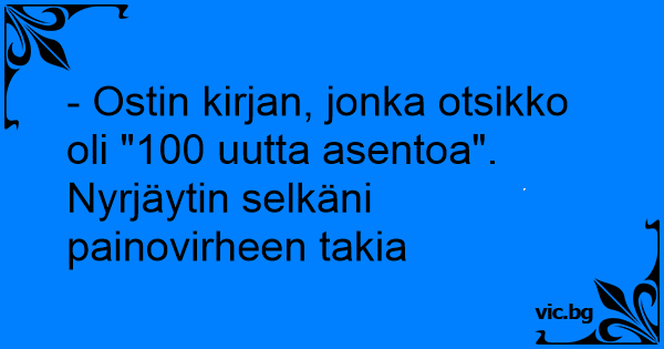 - Ostin kirjan, jonka otsikko oli "100 uutta asentoa". Nyrjäytin selkäni painovirheen takia