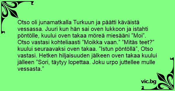 Otso oli junamatkalla Turkuun ja päätti käväistä vessassa. Juuri kun hän sai oven lukkoon ja istahti pöntölle, kuului oven takaa möreä miesääni ”Moi”. Otso vastasi kohteliaasti ”Moikka vaan.” ”Mitäs teet?” kuului seuraavaksi oven takaa. ”Istun pöntöllä”, Otso vastasi. Hetken hiljaisuuden jälkeen oven takaa kuului jälleen ”Sori, täytyy lopettaa. Joku urpo juttellee mulle vessasta.”