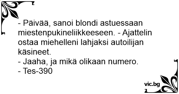 - Päivää, sanoi blondi astuessaan miestenpukineliikkeeseen. - Ajattelin ostaa miehelleni lahjaksi autoilijan käsineet.