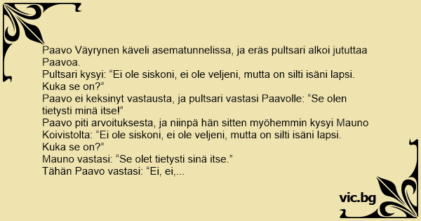 Paavo Väyrynen käveli asematunnelissa, ja eräs pultsari alkoi jututtaa Paavoa.