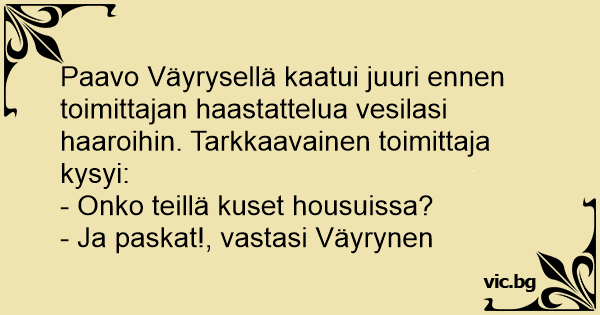 Paavo Väyrysellä kaatui juuri ennen toimittajan haastattelua vesilasi haaroihin. Tarkkaavainen toimittaja kysyi: