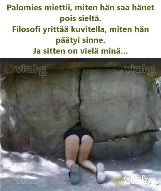 Ugunsdzēsējs domā, kā viņu dabūt ārā no turienes. Filozofs mēģina iedomāties, kā viņa tur nokļuva. Un tad esmu vēl es…