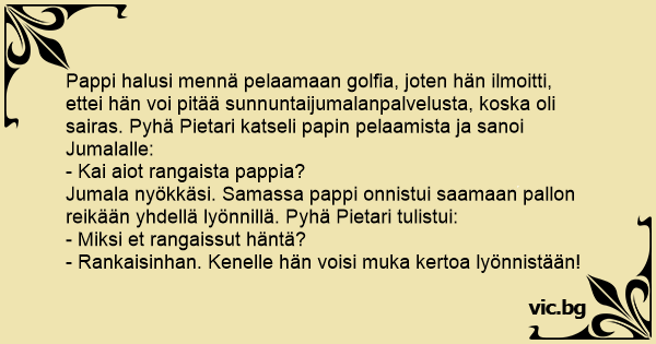 Pappi halusi mennä pelaamaan golfia, joten hän ilmoitti, ettei hän voi pitää sunnuntaijumalanpalvelusta, koska oli sairas. Pyhä Pietari katseli papin pelaamista ja sanoi Jumalalle:
