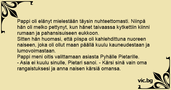 Pappi oli elänyt mielestään täysin nuhteettomasti. Niinpä hän oli melko pettynyt, kun hänet taivaassa kytkettiin kiinni rumaan ja pahansisuiseen eukkoon.