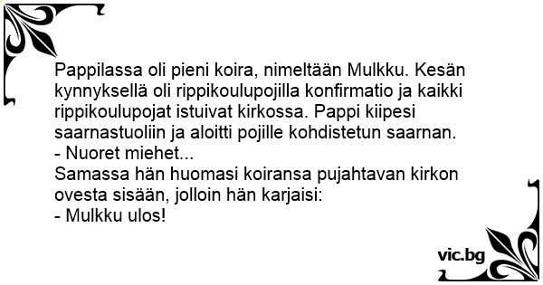 Pappilassa oli pieni koira, nimeltään Мulккu. Kesän kynnyksellä oli rippikoulupojilla konfirmatio ja kaikki rippikoulupojat istuivat kirkossa. Pappi kiipesi saarnastuoliin ja aloitti pojille kohdistetun saarnan.