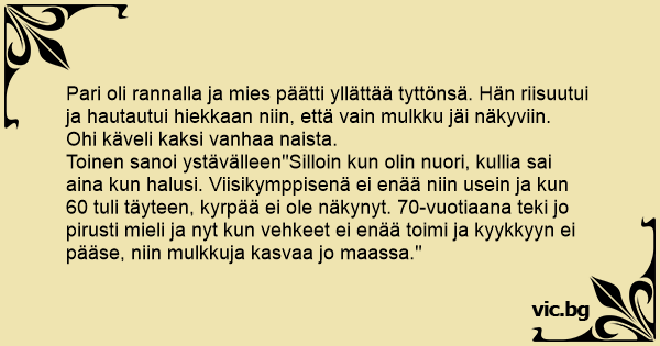 Toinen sanoi ystävälleen"Silloin kun olin nuori, kullia sai aina kun halusi. Viisikymppisenä ei enää niin usein ja kun 60 tuli täyteen, kyrpää ei ole näkynyt. 70-vuotiaana teki jo pirusti mieli ja nyt kun vehkeet ei enää toimi ja kyykkyyn ei pääse, niin mulkkuja kasvaa jo maassa."