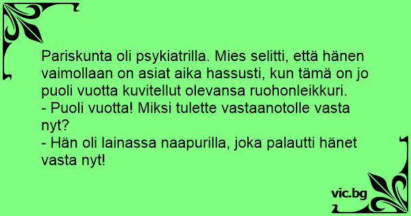 Pariskunta oli psykiatrilla. Mies selitti, että hänen vaimollaan on asiat aika hassusti, kun tämä on jo puoli vuotta kuvitellut olevansa ruohonleikkuri.